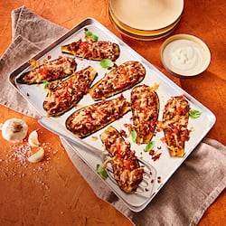 Auflauf noch in der Form auf den Tisch stellen oder auf Tellern anrichten.