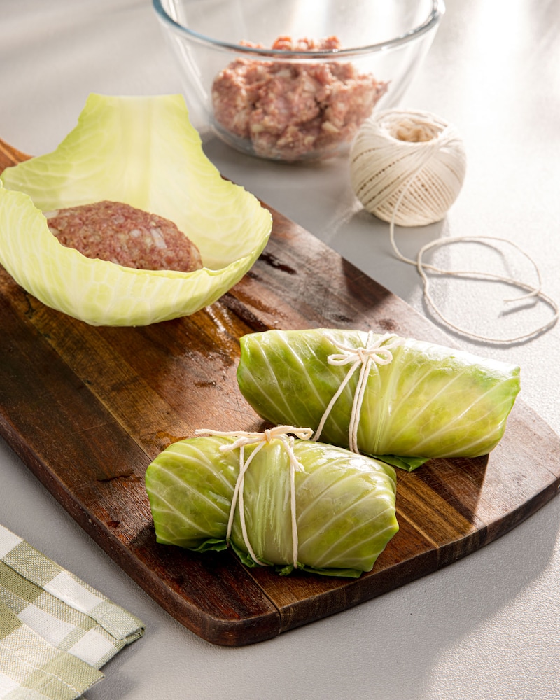 Aus der Hackfleischmasse 8 kleine Würste formen und je eine auf den blanchierten Kohlblättern verteilen. Kohl über dem Hack seitlich einschlagen und dann zu Rouladen aufrollen. Mit Rouladennadeln, Zahnstochern oder Küchengarn fixieren.