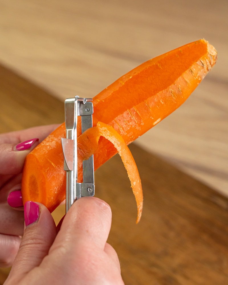 Möhre schälen, putzen und in sehr feine Stifte schneiden.