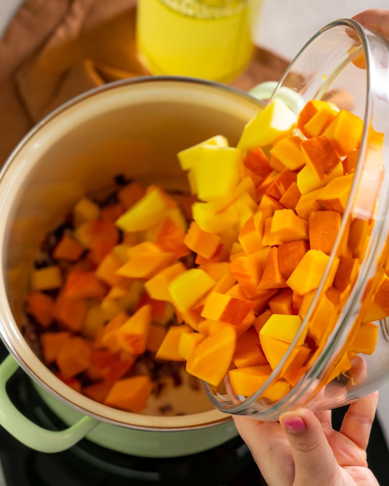 Mit der Gemüsebrühe ablöschen und zugedeckt ca. 20 Min. köcheln lassen, bis Kürbis und Kartoffeln sehr weich sind.