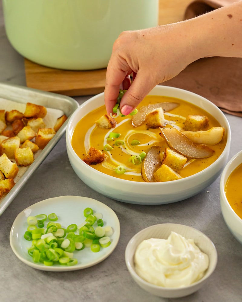 Heiße Suppe auf tiefe Teller verteilen, Birnenspalten auf die Teller verteilen und das Ganze mit einem Klecks Crème fraîche, Croûtons und Frühlingszwiebeln garnieren.