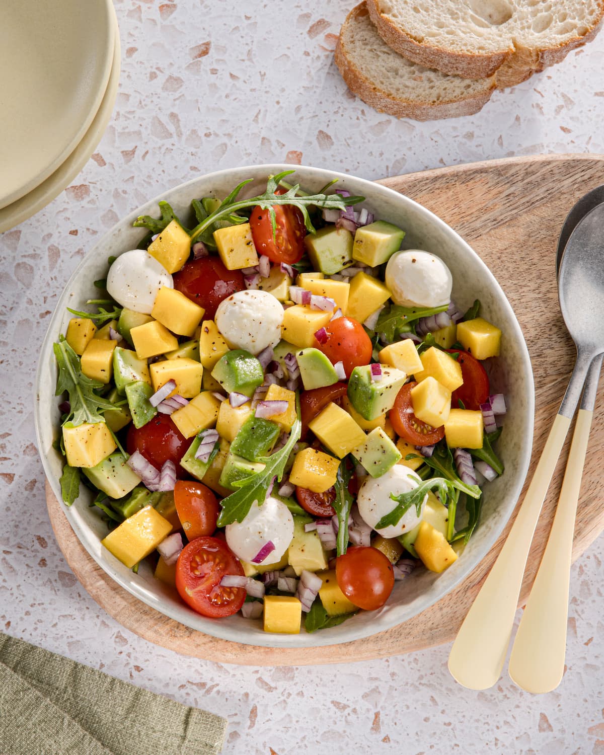 Den Salat mit Mango, Avocado, Rucola, Tomaten und Mini-Mozzarella kannst du wunderbar variieren. Zum Beispiel passen knackige Gurkenwürfel, frische Kräuter wie Basilikum, Minze oder Koriander, geröstete Nüsse oder ein paar Croûtons. Ein Spritzer Limette sorgt für extra Frische. So wird dein Salat noch bunter, aromatischer und richtig sommerlich.