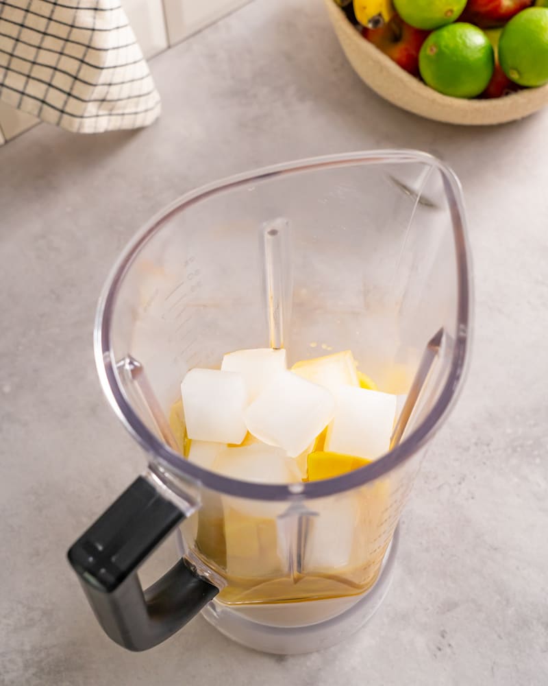 Limettensaft mit Mango, Orangensaft und Wasser in einen Standmixer geben.