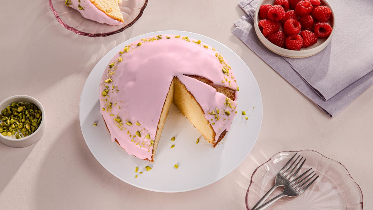 Pistazien hacken. Den Zuckerguss über den Kuchen geben und mit Pistazien garnieren. Nach Belieben noch Himbeeren hinzufügen.