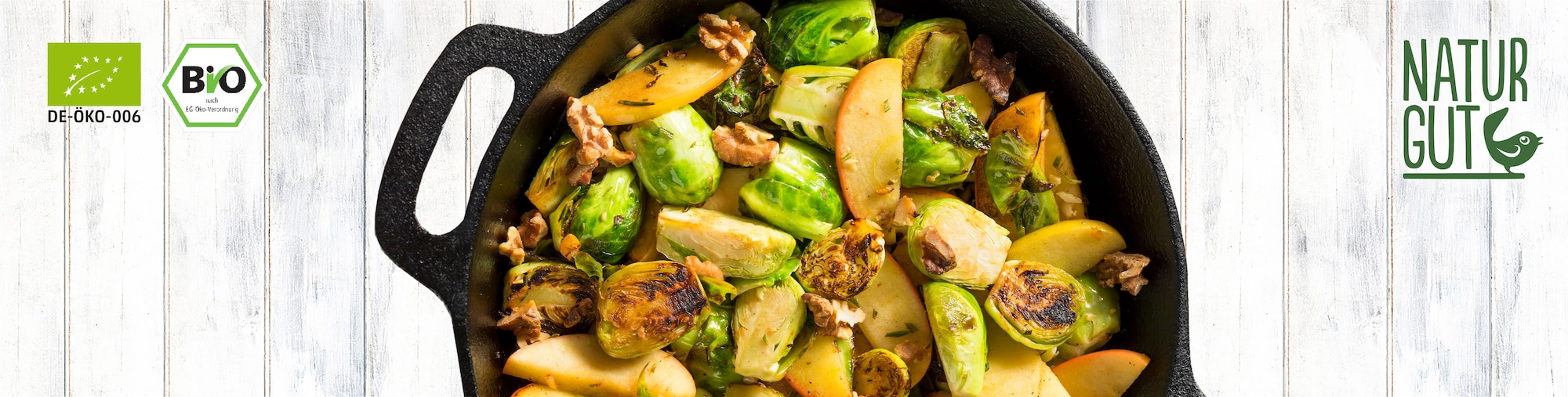 Erhitzt Öl in einer Pfanne, bratet Rosenkohl und Birnenspalten ca. 5 Minuten darin an.