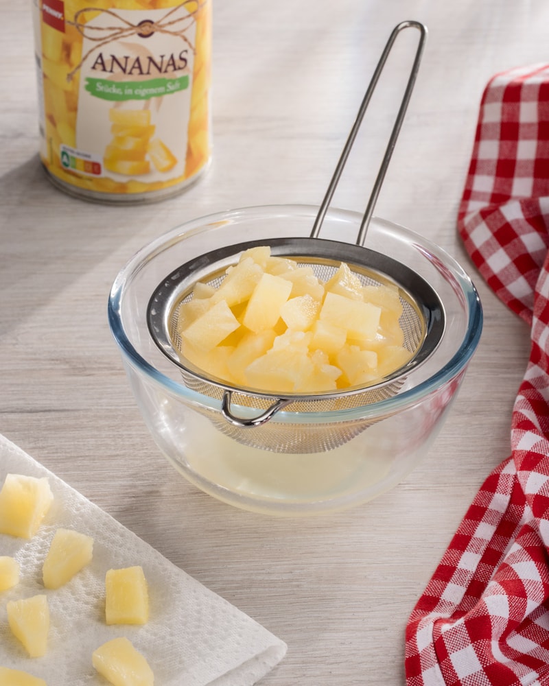 Ananas mit Küchenpapier trocken tupfen und auf die Pizza legen.