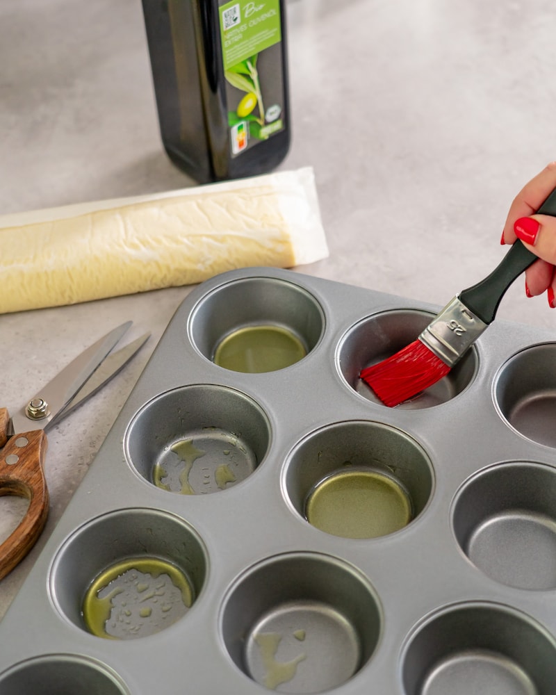 Backofen auf 200 °C (Ober-/Unterhitze) vorheizen, Muffinblech mit Olivenöl einfetten - jeweils 4 Mulden pro Portion.