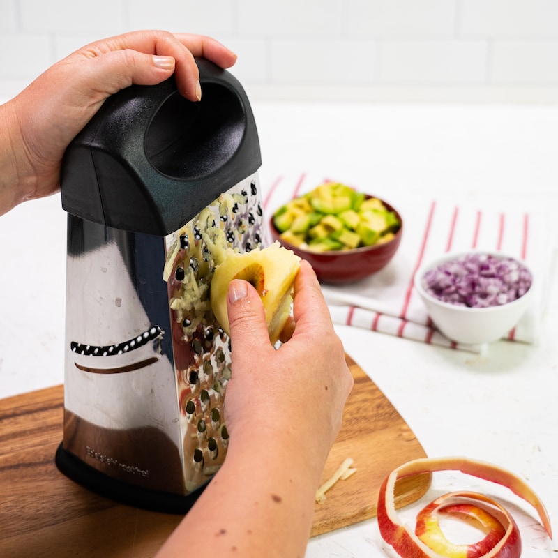 Die Äpfel ebenfalls schälen, anschließend das Kerngehäuse entfernen und die Fruchtspalten mit einer Küchenreibe fein raspeln.