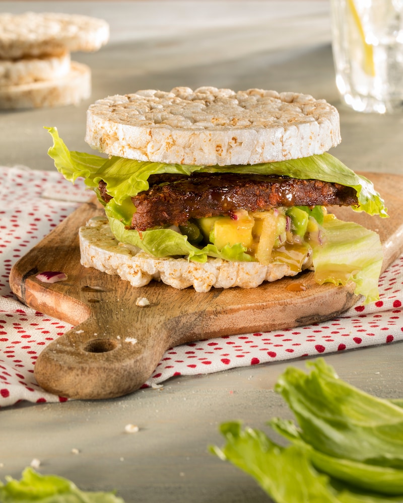 Es geht ans Schichten deiner veganen Burger: die Hälfte der Reiswaffeln belegst du mit je 2 Blättern Eisbergsalat, die quasi als kleine „Schüsselchen“ dienen. Darauf verteilst du dann behutsam die Avocado-Mischung sowie die Patty-Streifen. Mit der Balsamicocreme übergießen und jeweils mit einer weiteren Reiswaffel bedecken. Sofort servieren!