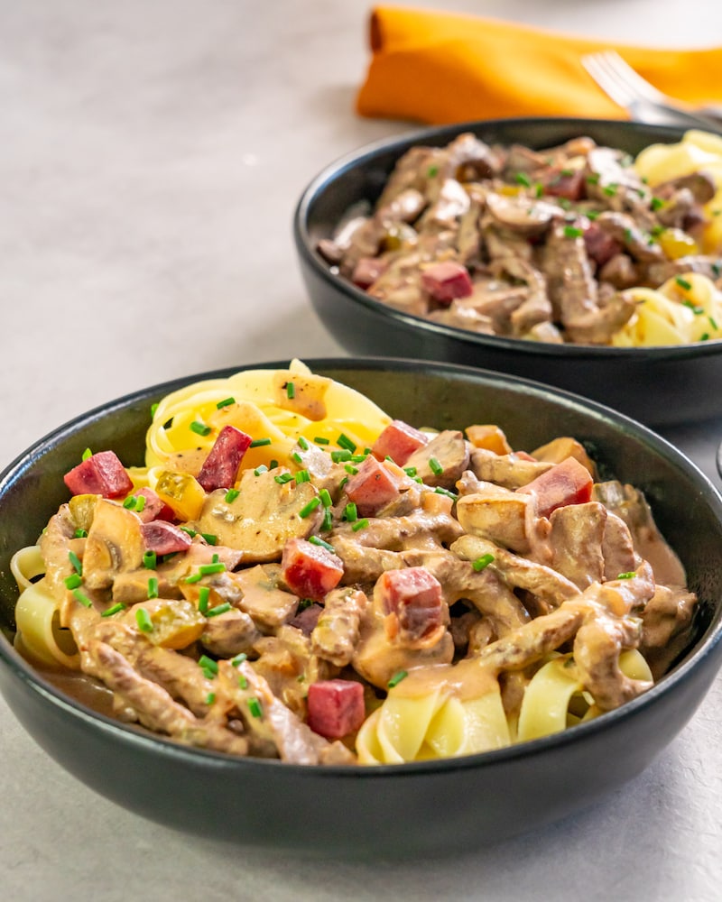 Nudeln auf Tellern verteilen und das Rindergeschnetzelte Stroganoff darauf oder daneben anrichten.