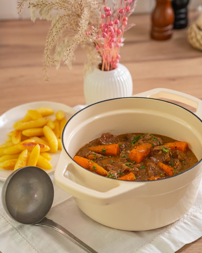40 g Butter und Öl in einem Bräter erhitzen, das Fleisch darin nach und nach anbraten. Aus dem Bräter nehmen. Zwiebelscheiben und gehackte Möhren im Bratensatz rösten. Das Fleisch wieder dazugeben. Alles würzen, Brühe angießen und bei mittlerer Hitze zugedeckt 50–60 Min. köcheln lassen. Dabei ab und zu umrühren. Nach 40 Min. Garzeit die geschnitzten Möhrchen auf das Fleisch legen und mitgaren.