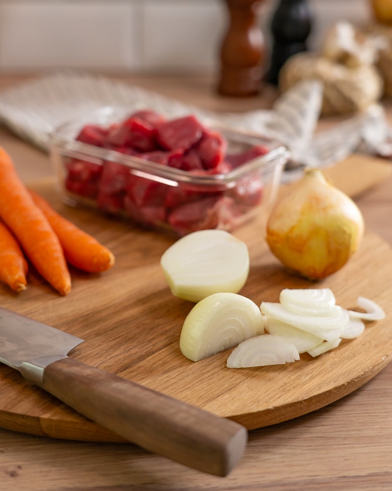 Fleisch trocken tupfen. Zwiebeln schälen, halbieren und in dünne Scheiben schneiden. Möhren schälen. Die Hälfte in Stücke (5–7 cm) schneiden und von der Mitte an bis zum Ende kegelförmig schnitzen, sodass kleine Möhrchen entstehen. Beiseite legen und übrige Möhren fein hacken.