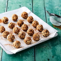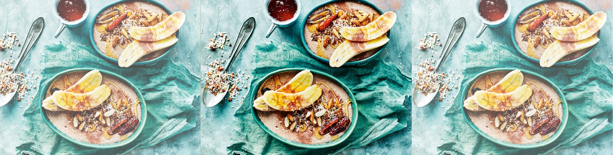Die gekühlten Bowls mit etwas Kakaopulver bestäuben. Vor dem Servieren die Bowls mit den übrigen Mandeln und halbierten Datteln belegen. Wer es besonders dekorativ mag, kann die Bowl zusätzlich mit einer kleinen halbierten Banane aufpeppen. Außerdem könnt ihr diesen Powersnack mit einem Schuss Ahornsirup verfeinern. Das verleiht der Bowl eine karamellähnliche Note.