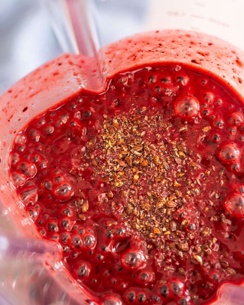 Leinsamen unter den Smoothie ziehen und ca. 10 Min. quellen lassen - dabei möglichst kalt stellen.