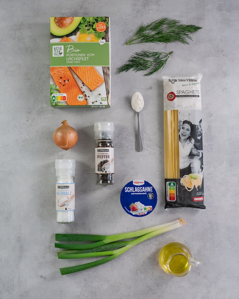 Die Soße würzt du noch mit Salz, Pfeffer und Dill. Dann kannst du die Teller anrichten – Nudeln unten, Soße mit Lachs und Lauchzwiebeln obenauf.