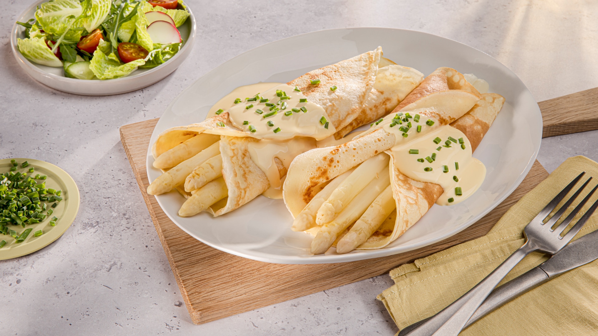Je 2 mit Spargel gefüllte Pfannkuchen auf einem Teller anrichten und mit Hollandaise beträufeln. Eventuell mit Schnittlauchröllchen garnieren.