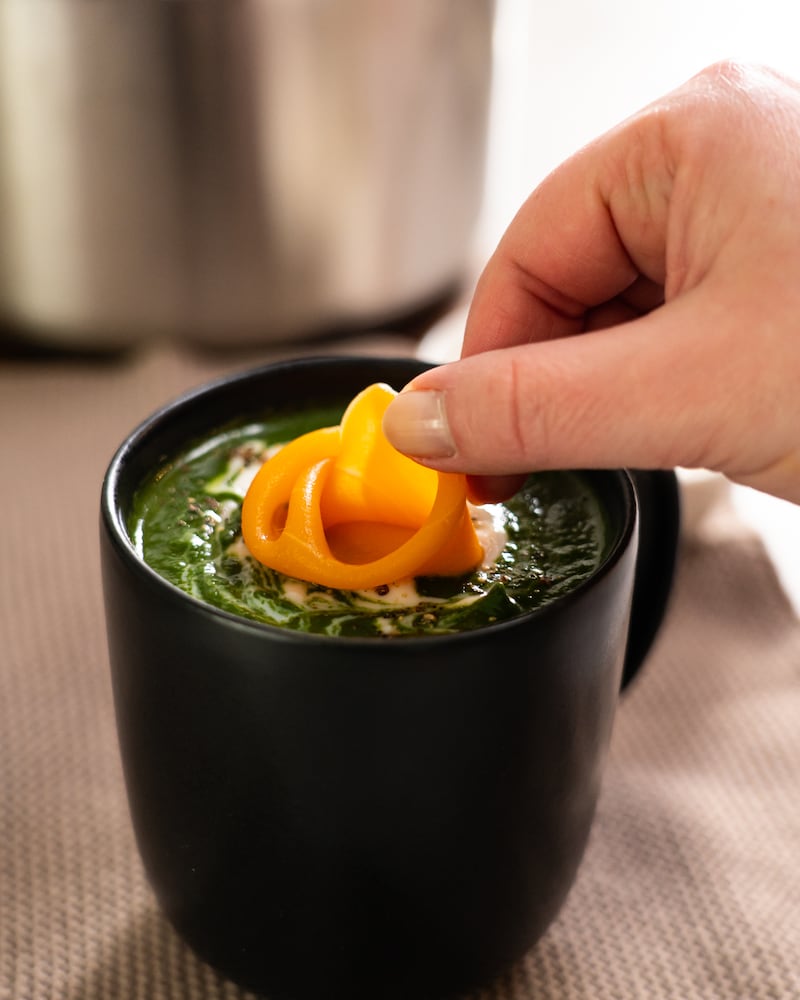 Tipp: Für ein feuriges Topping 1 TL Olivenöl in einer beschichteten Pfanne erhitzen. Veganen Räucherlaxx grob würfeln und 3–4 Min. darin anbraten. Zuletzt mit einem Spritzer Zitronensaft und ½ TL Chiliflocken würzen und auf die Suppe geben.