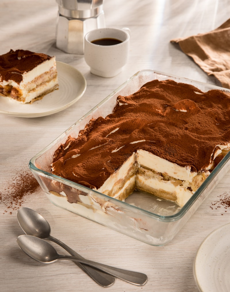 Die Hälfte der Creme darauf verteilen, dann folgt eine weitere Schicht in Kaffee getränkter Löffelbiskuits und noch einmal Creme.