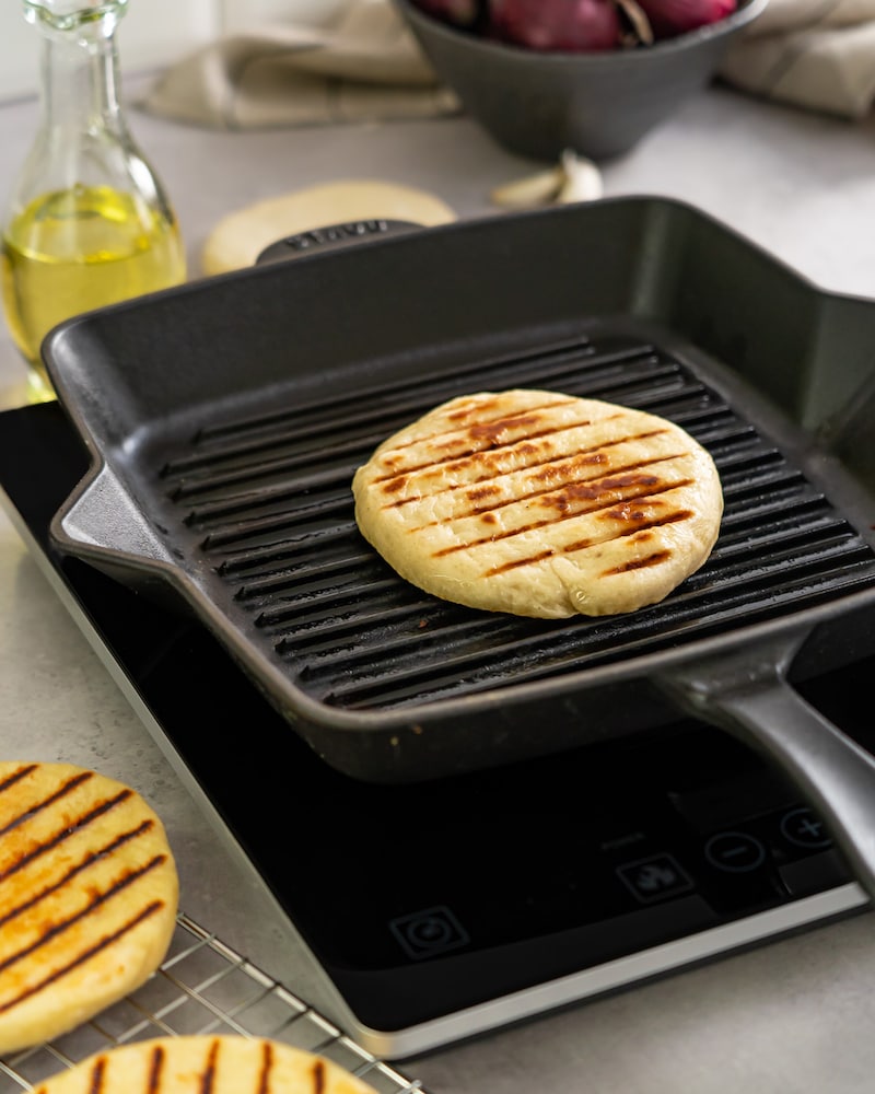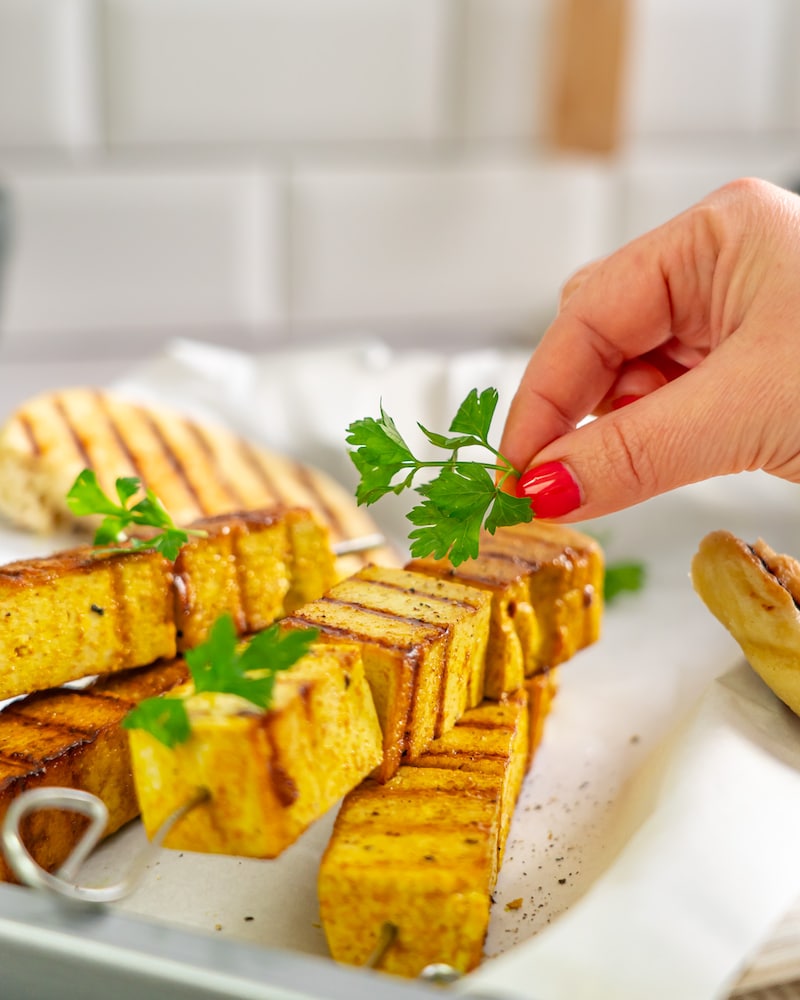 Teig kurz durchkneten und auf bemehlter Fläche zu vier dünnen Fladen ausrollen. Mit etwas Öl bepinseln und auf dem heißen Grill oder in der heißen Grillpfanne von beiden Seiten jeweils 2-3 Min. backen. Fladenbrot mit Tofu-Spießen anrichten. Mit Petersilie und Sesam nach Belieben bestreuen. Zitrone achteln und die Spalten dazu reichen.