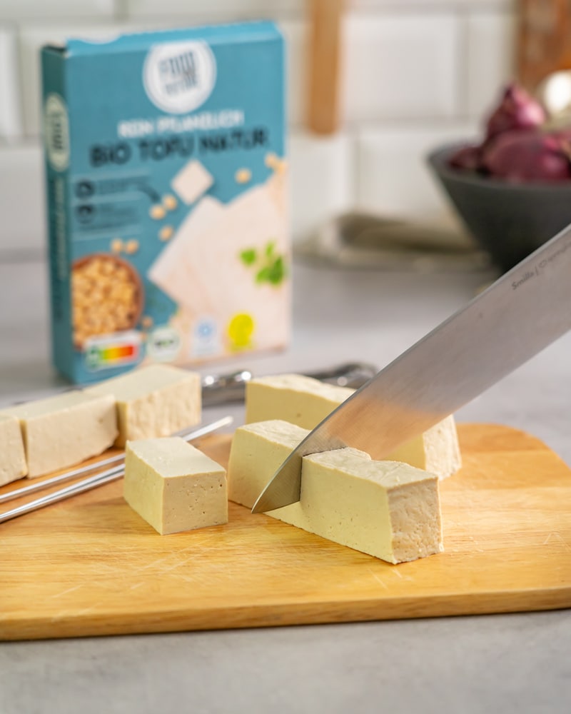 Inzwischen Grill vorheizen oder eine Grillpfanne auf den Herd stellen. Tofu trocken tupfen, in mundgerechte Stücke schneiden. Sojasauce, Öl, Curry, Kurkuma und Orangensaft verrühren. Tofu auf Metallspieße stecken und rundherum mit der Marinade einpinseln. Übrige Marinade beiseitestellen.