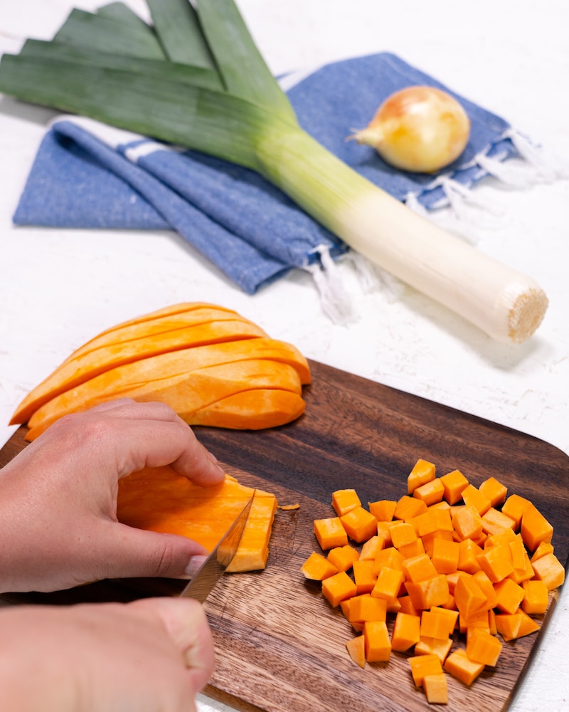 In der Zwischenzeit hast du Zeit für den Lauch: Das passende Stück der Länge nach einschneiden, äußere Blätter entfernen und alle anderen gut waschen – ohne, dass alles auseinanderfällt. Dann kannst du die halbierten Stangen in mundgerechte Stücke schneiden.