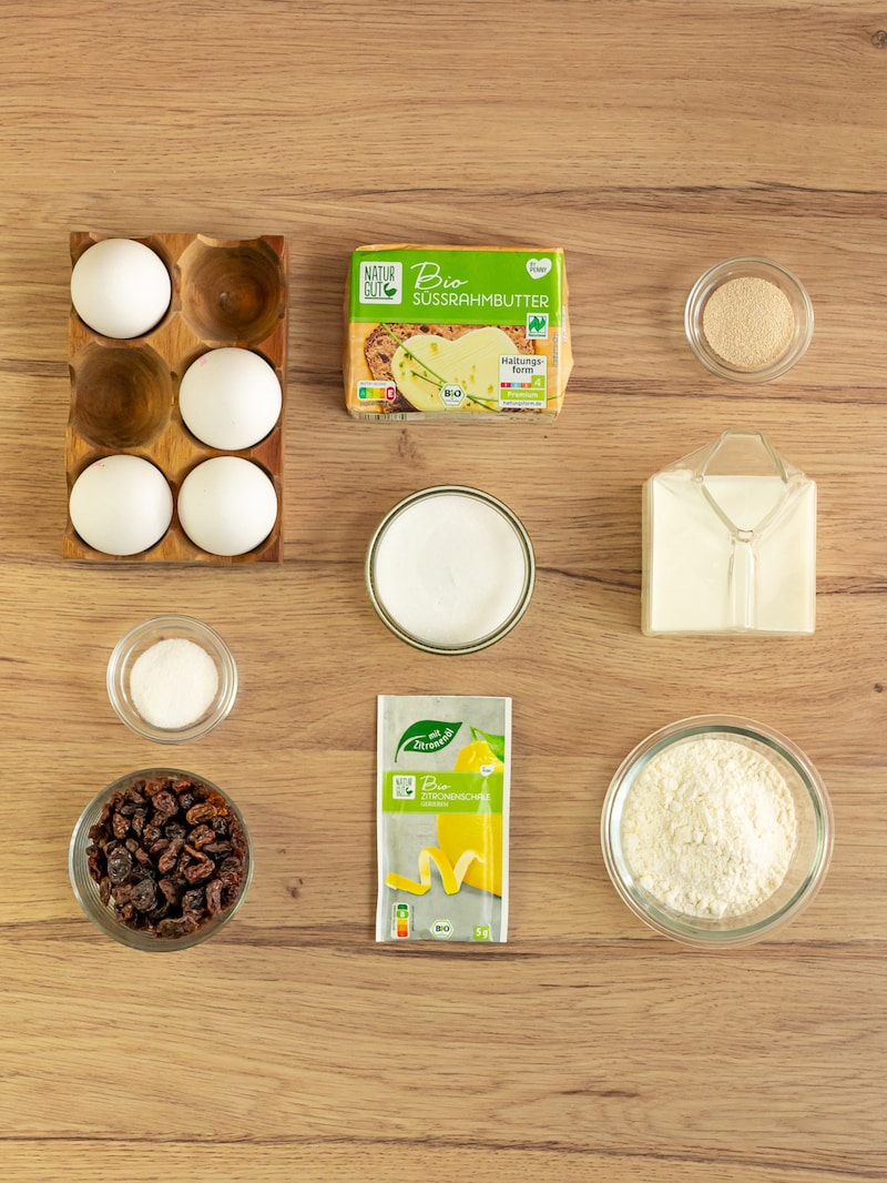 Mehl in einer großen Schüssel mit Zucker, Vanillinzucker, Bio- Zitronenschale, Hefe und Salz mischen, dann die lauwarme Milch und das Ei unterziehen – entweder mit den Händen oder mit den Knethaken des Handrührgerätes. Alles ca. 5 Min. lang zu einem gleichmäßigen, elastischen Hefeteig verkneten.